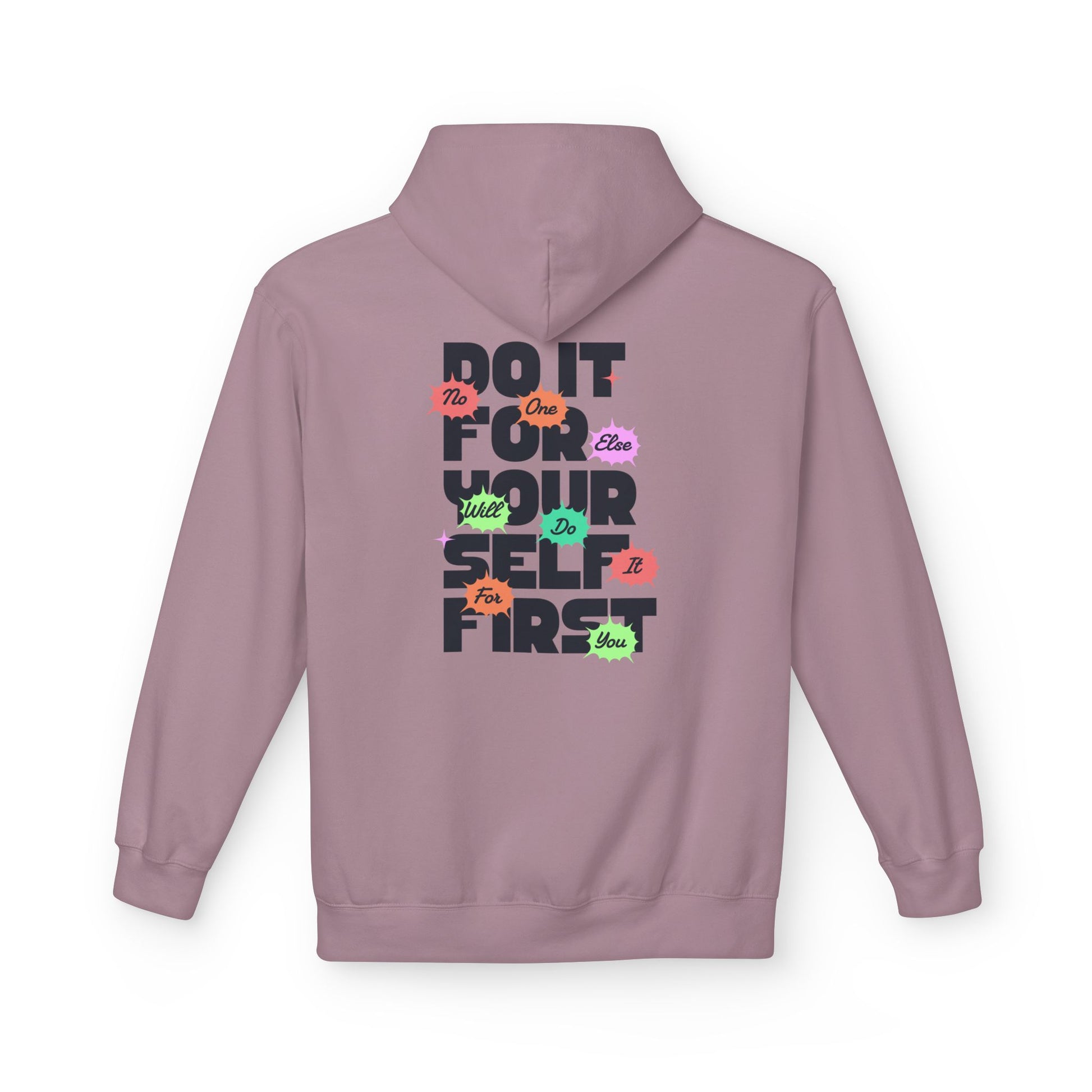 This midweight hoodie brings quiet confidence to everyday wear. The clean, minimal front script pairs with a bold back message — a layered reminder to put yourself first, framed by colorful accent shapes for a playful, modern edge. The dropped shoulders and roomy pouch pocket invite relaxed movement, while the soft fleece body keeps things comfortably warm without bulk. Thoughtfully made with OEKO-TEX certified materials in socially responsible facilities, it’s a wearable choice for people who value comfort, clarity, and conscientious production. Wear it to slow mornings, studio sessions, or city walks when you need a gentle nudge toward self-care.