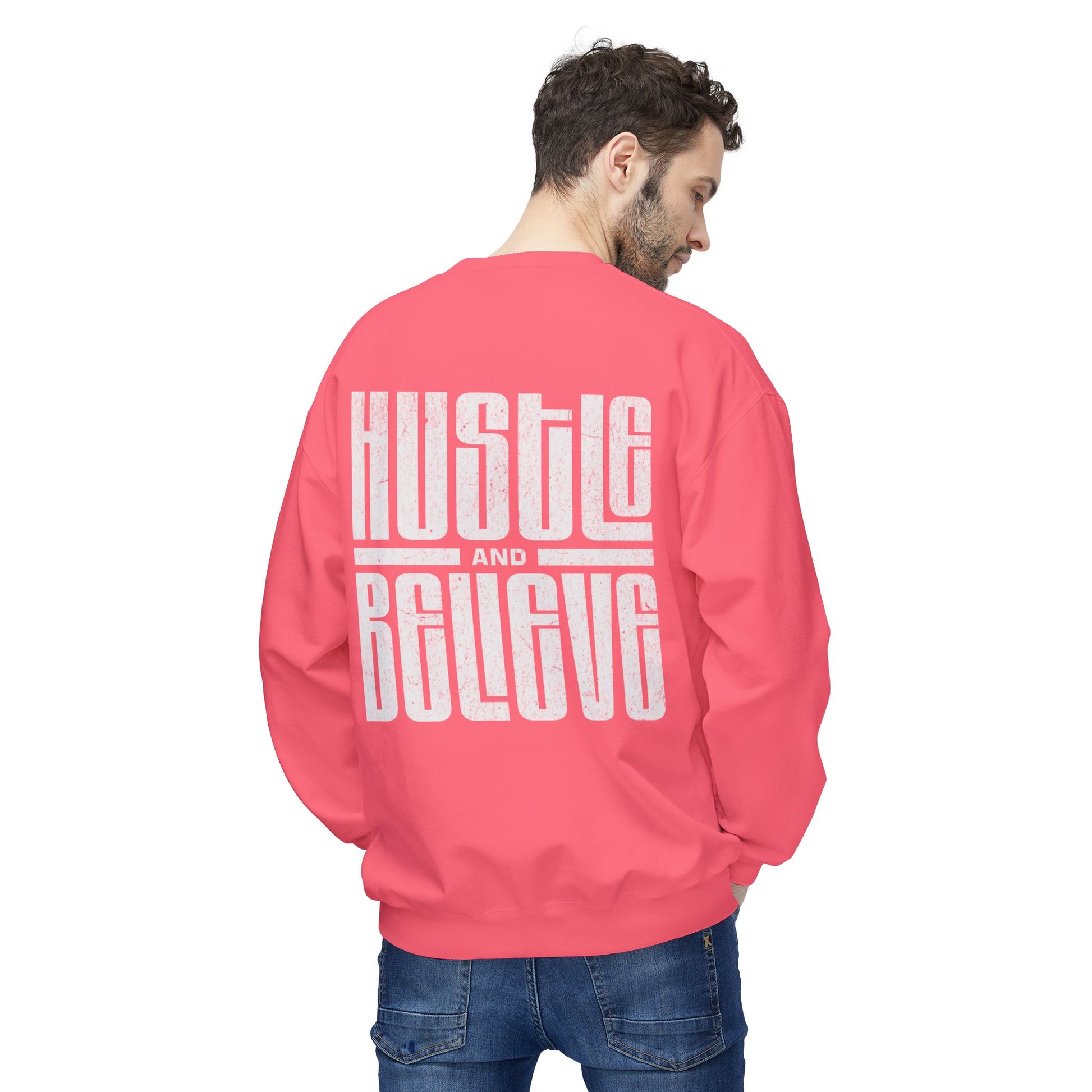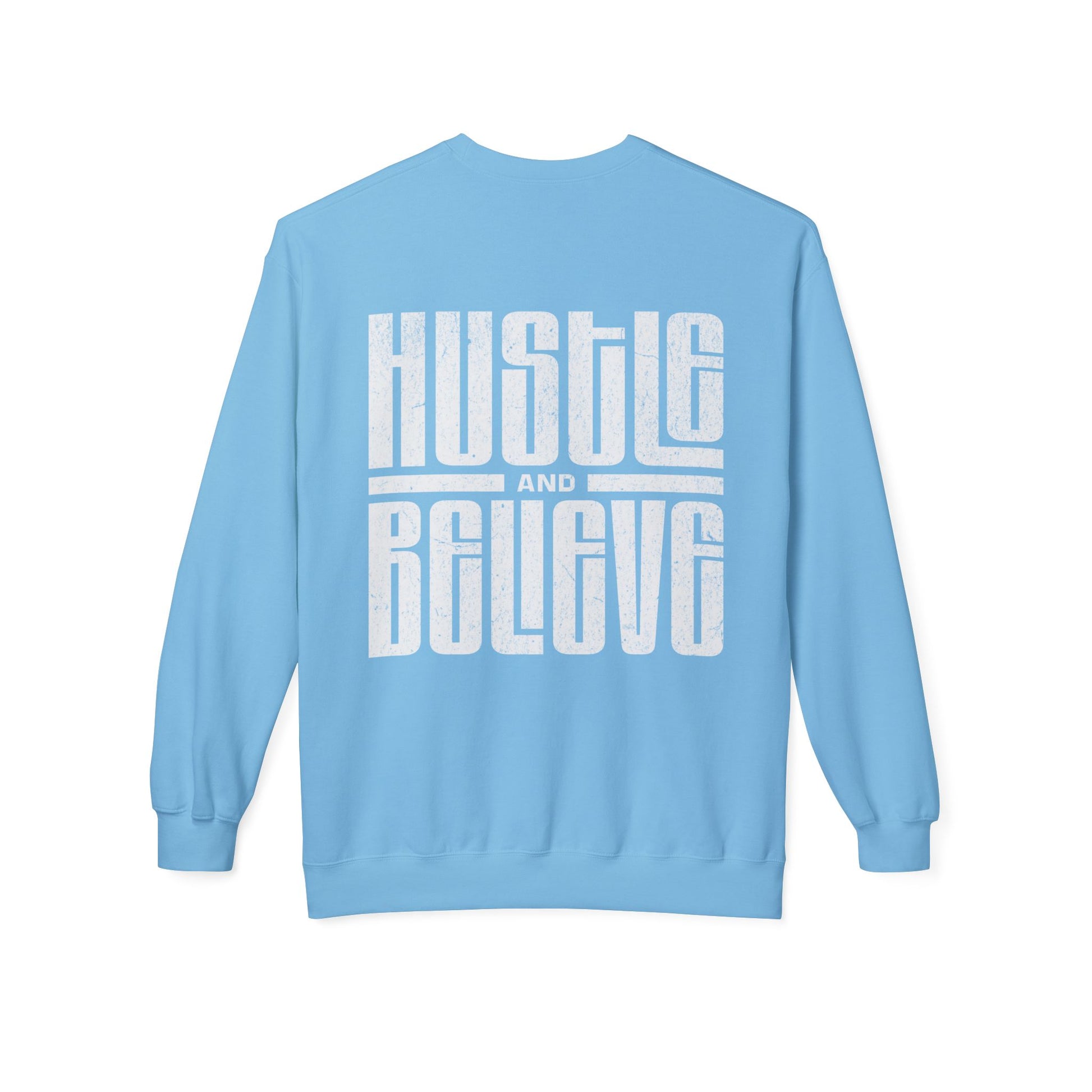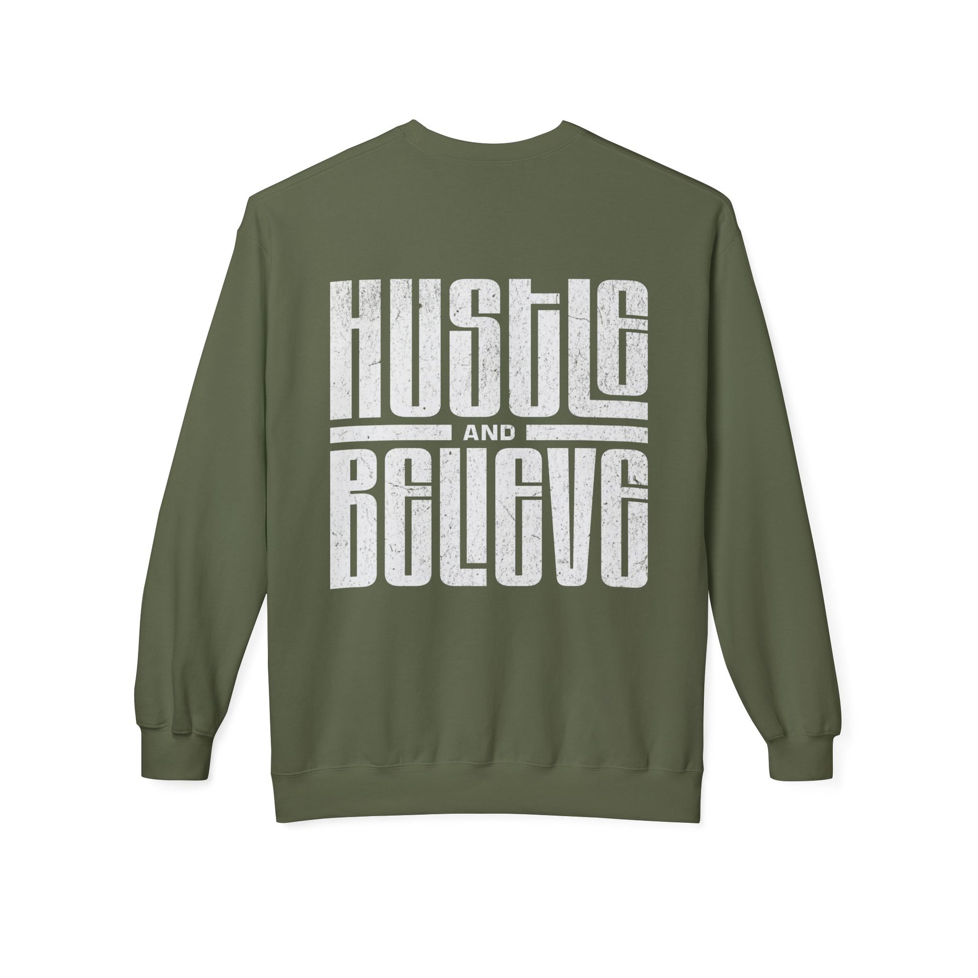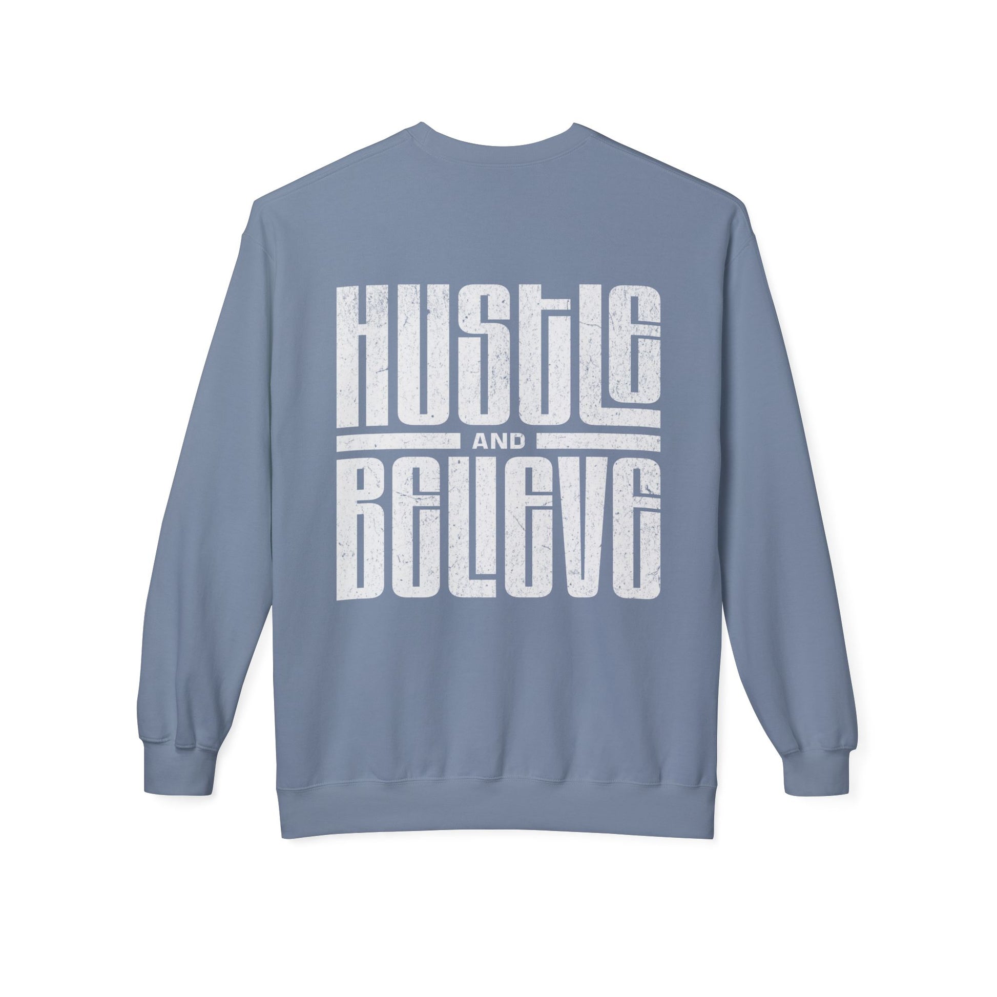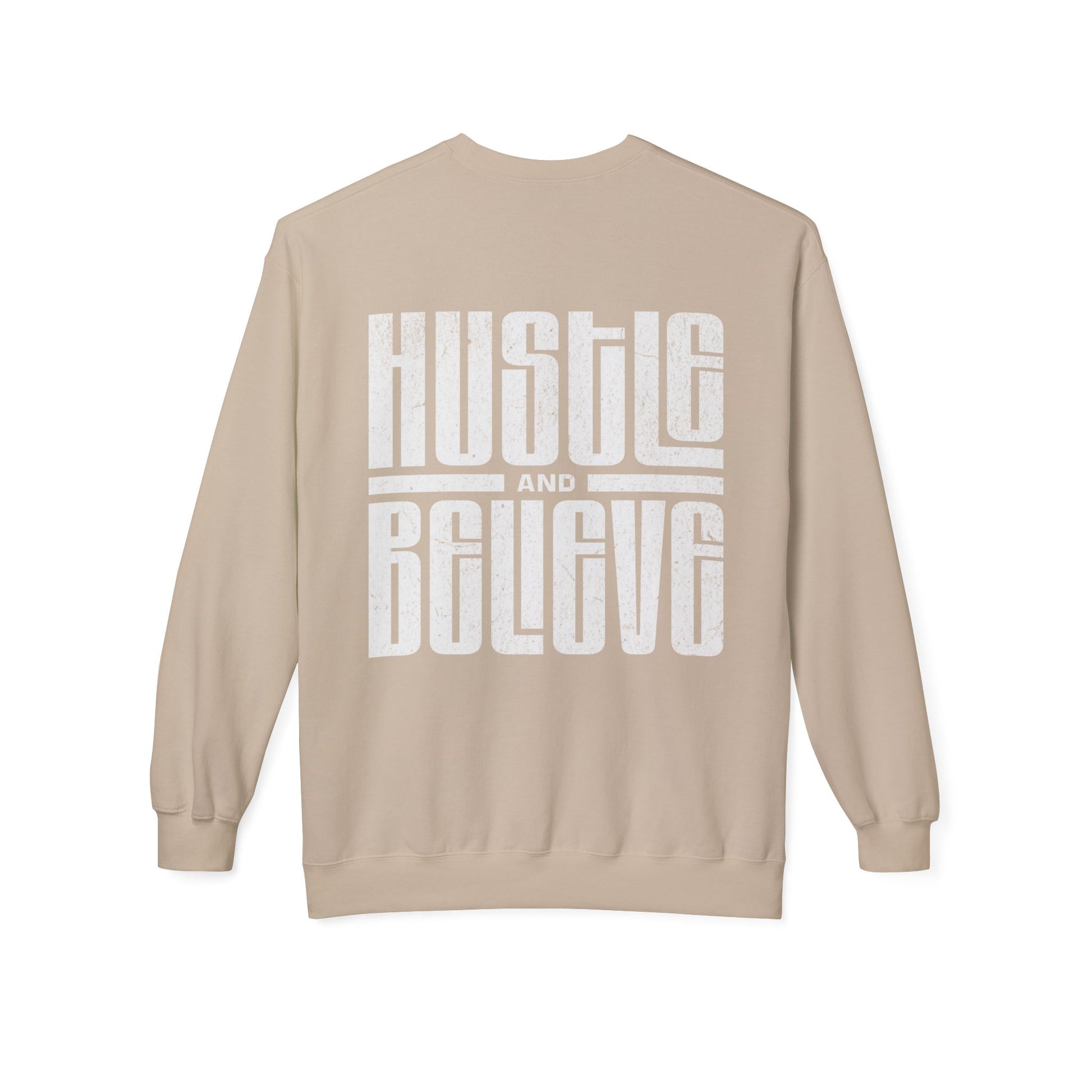 This midweight crewneck brings quiet confidence to everyday wear. Soft, slightly structured fabric and dropped shoulders create an easy silhouette that still reads intentional. On the front a small, crowned script mark sits over the heart; across the back a bold, weathered “HUSTLE AND BELIEVE” block print makes your mindset clear without shouting. It’s the kind of sweatshirt you reach for when you need steady warmth, a reminder to keep moving, and a low-key statement that blends with layered looks or stands alone on cool mornings and late-night walks.