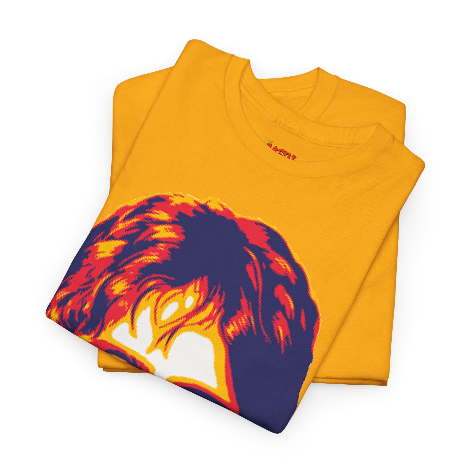 This classic cotton tee carries a bold, retro-style portrait printed on a clean white canvas. The artwork uses warm, saturated tones and simplified shapes to create a vintage poster vibe — striking on its own yet easy to wear with everyday layers. The shirt’s relaxed silhouette and soft, midweight fabric make it comfortable for long days, whether you’re wandering a record shop, sketching in a café, or meeting friends at an evening show. It reads like a wearable conversation piece: familiar but stylized, nostalgic without feeling dated. Sized for adult wearers, the tee keeps its shape and print clarity wash after wash, so the design stays vivid and the fit stays relaxed.