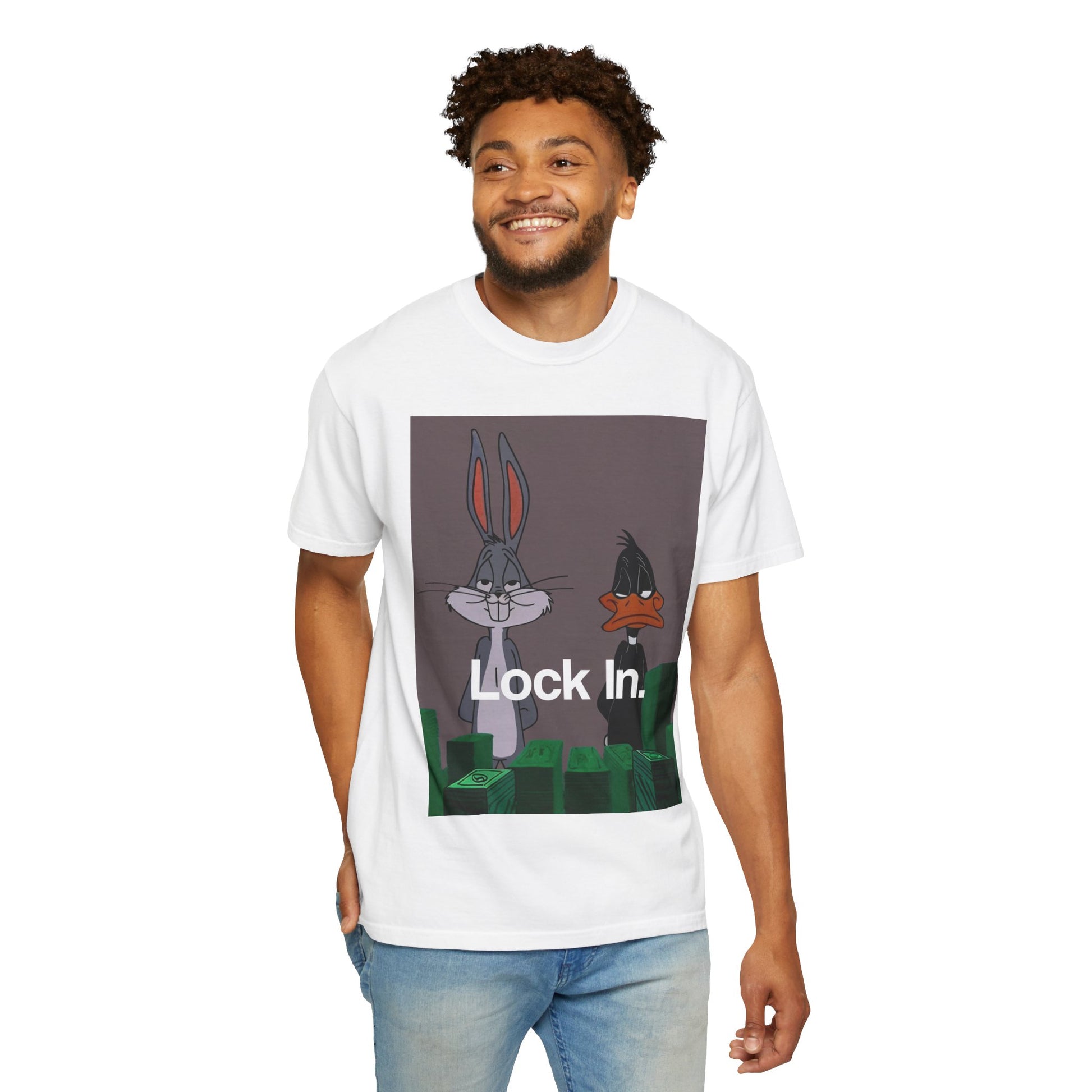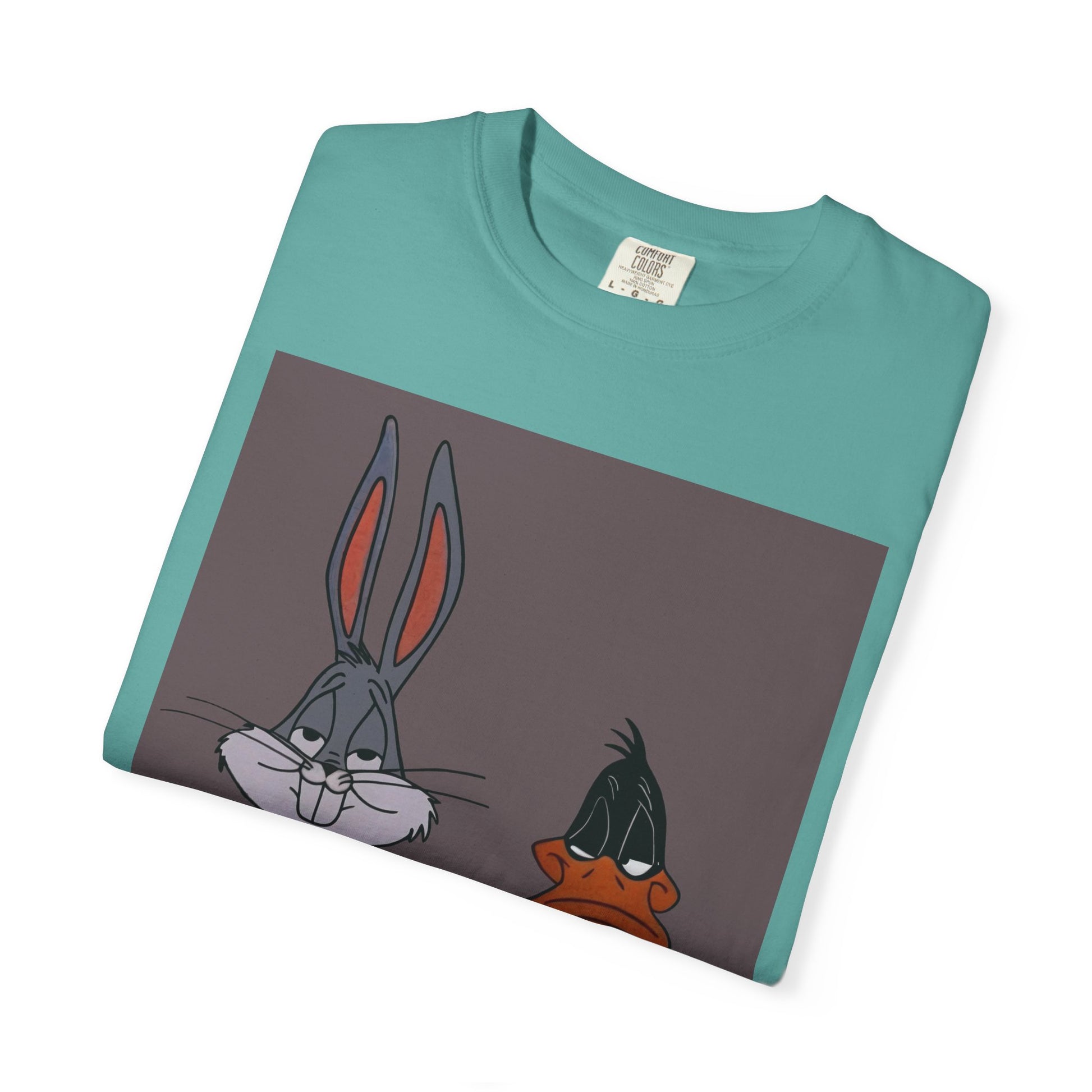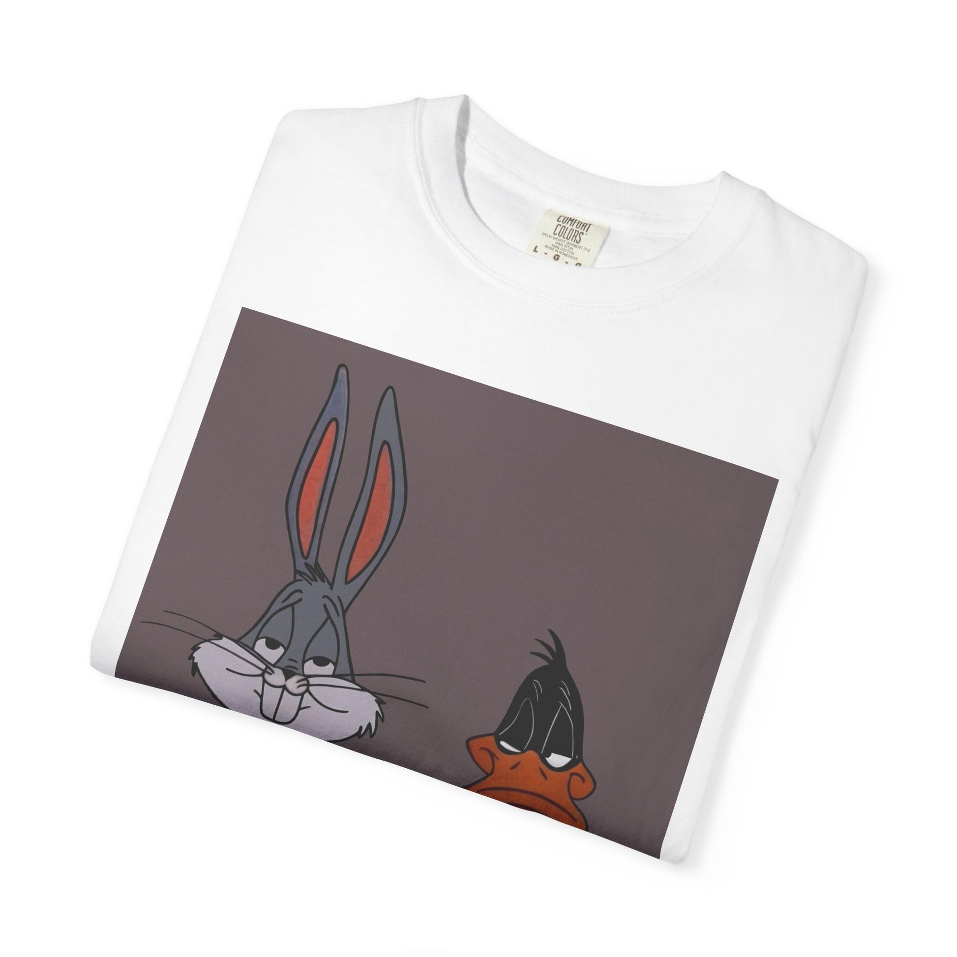 This heavyweight, garment-dyed tee brings a relaxed, lived-in feel to your everyday rotation. Built from 100% ring-spun US cotton and knit as a tubular body, it sits soft against the skin and keeps a clean silhouette without side seams. The front print—nostalgic cartoon faces framed above a simple, bold phrase—reads like a wink to quiet confidence. Wear it layered over a long-sleeve or on its own; the muted dye and sturdy construction age beautifully with wash and wear, becoming more personal over time. It’s made for easy weekends, late-night hangs, and days when comfort and attitude matter equally.