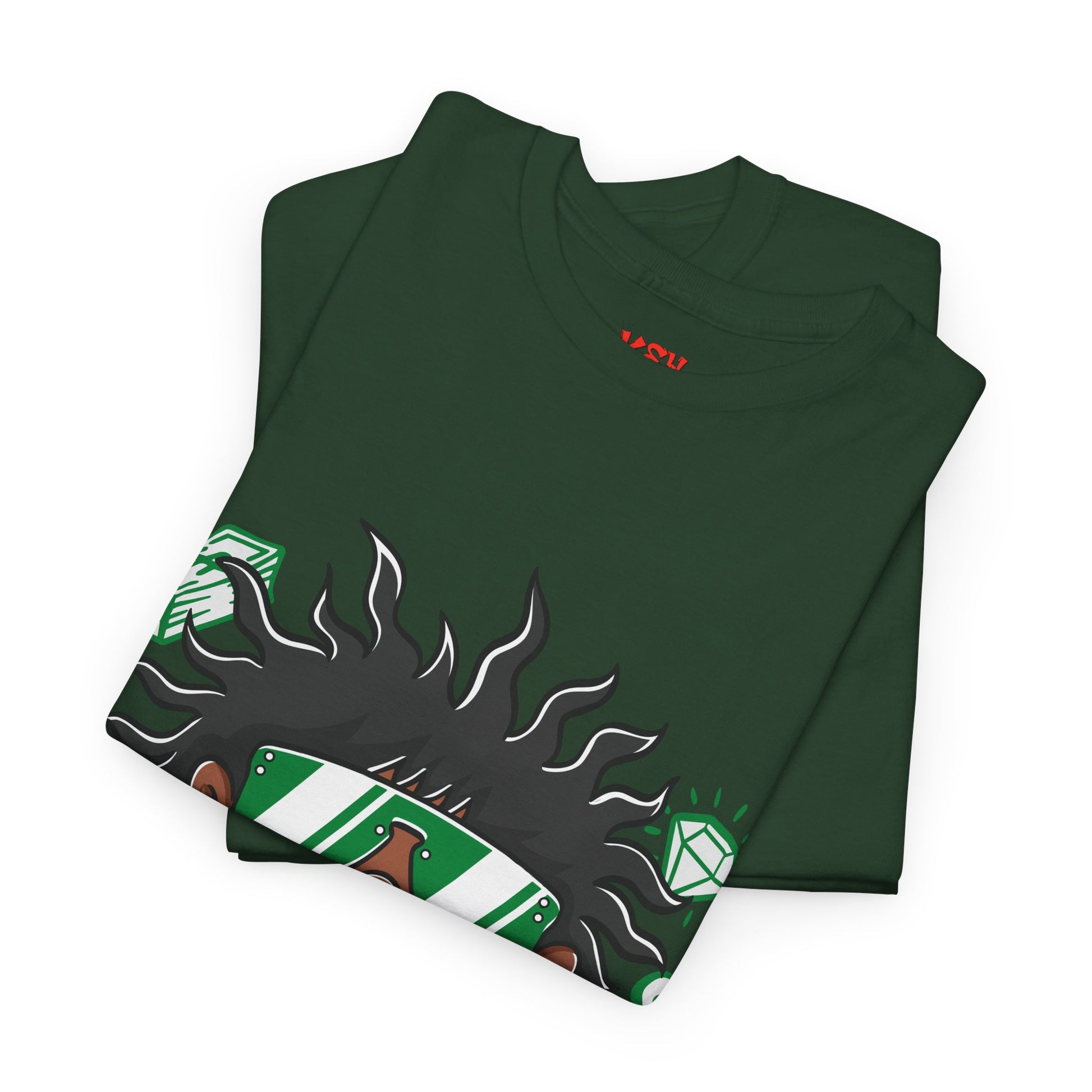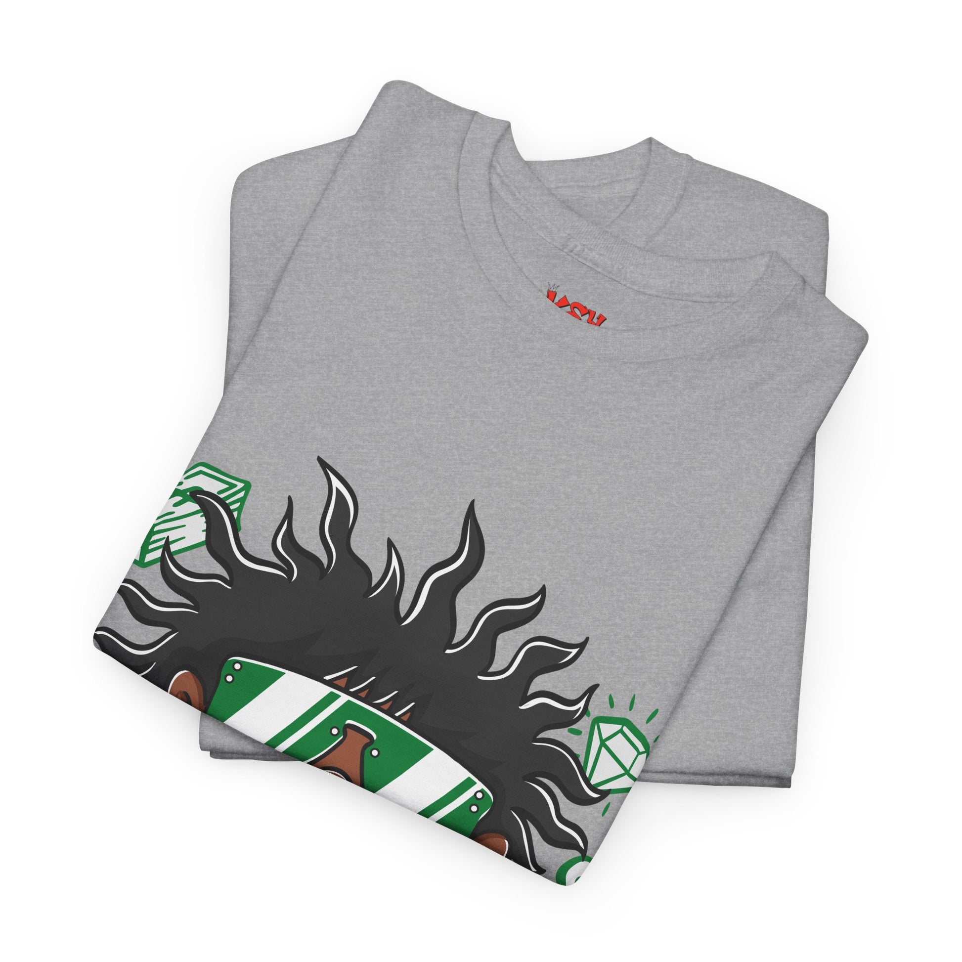 A bold streetwear tee that channels playful confidence and urban swagger. The mid-weight cotton feels sturdy and familiar, while the vibrant front graphic pops with energetic color—an expressive cartoon character with wild hair, oversized shades, and flashy jewelry framed by green gems. It wears like a laid-back staple: roomy through the body with a classic crew neckline and tear-away label for comfort. Durable construction—twill shoulder tape and a tubular, seam-free body—keeps shape wash after wash. This shirt sits naturally in city-styled outfits, gallery nights, or chill hangouts where personality speaks louder than logos.