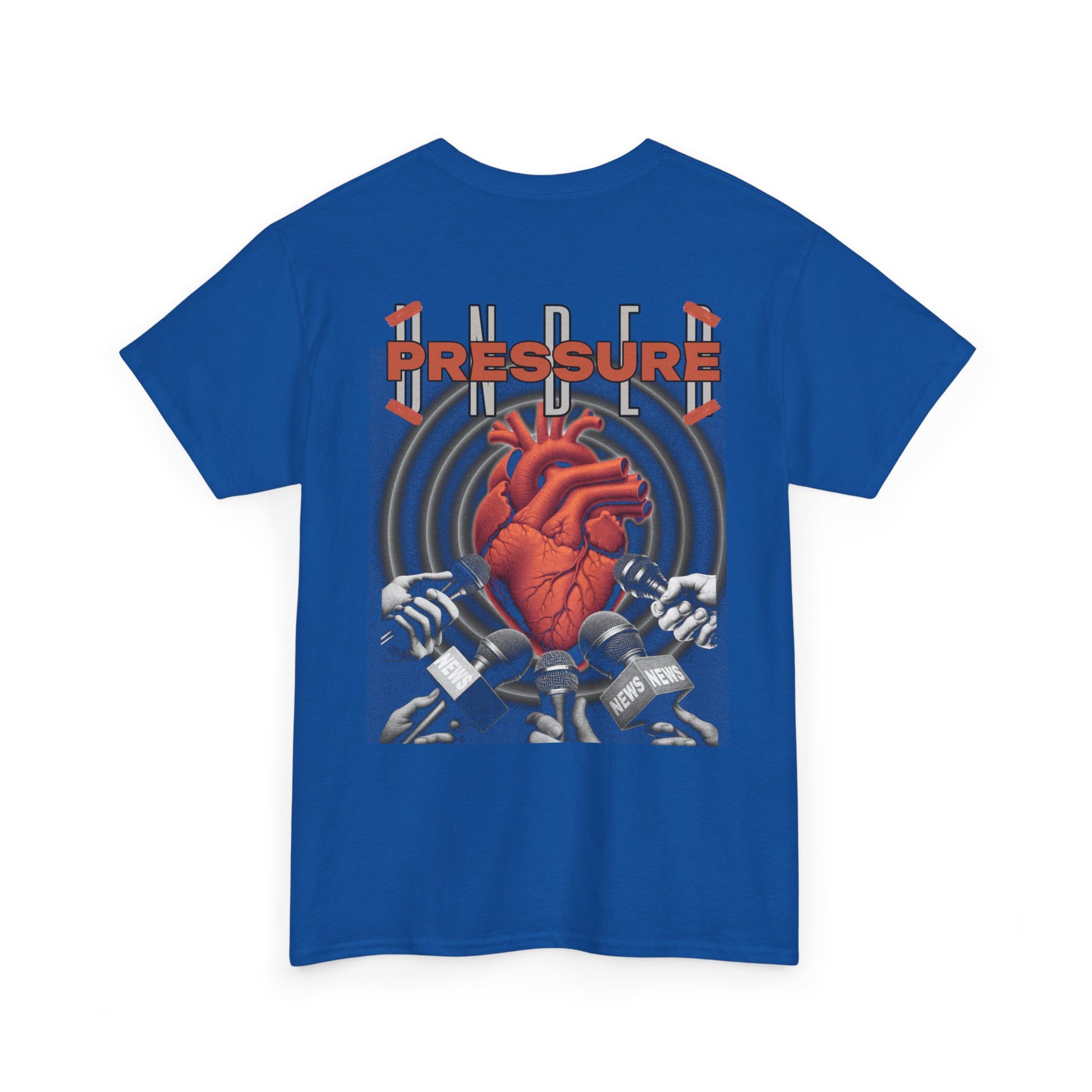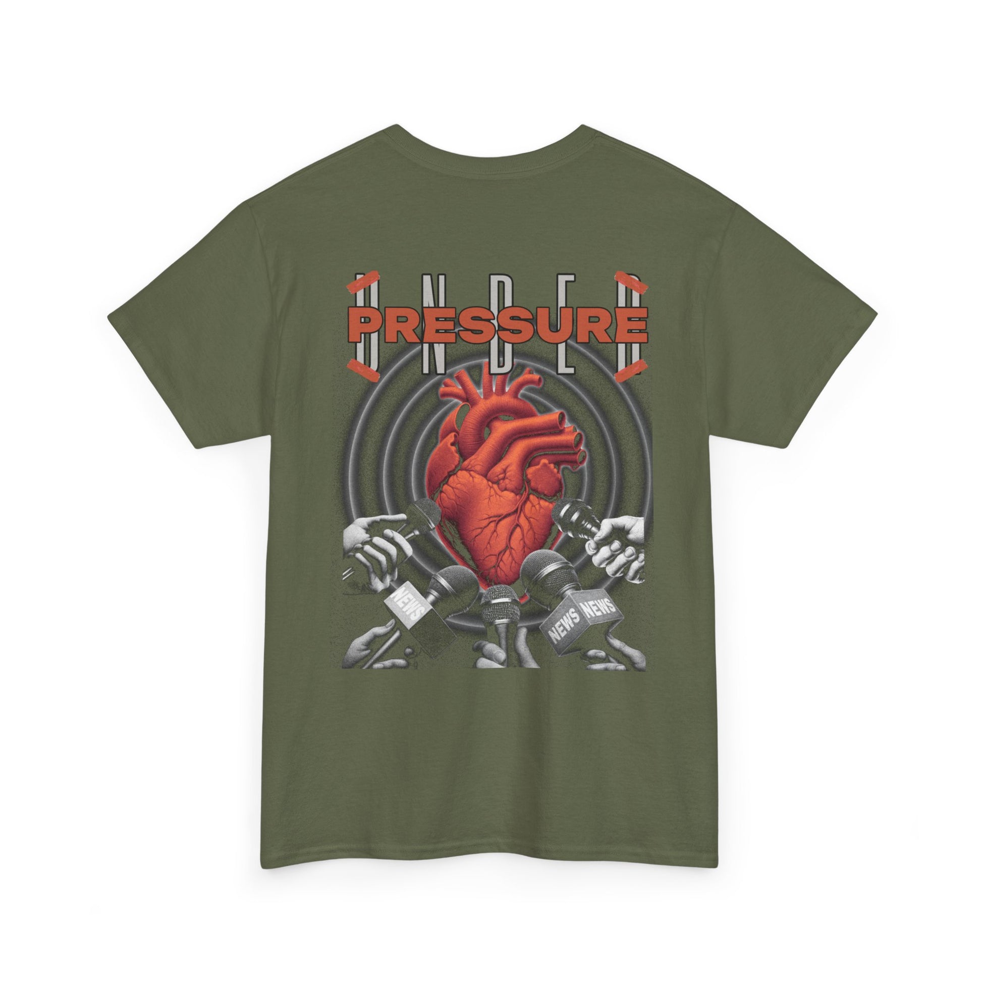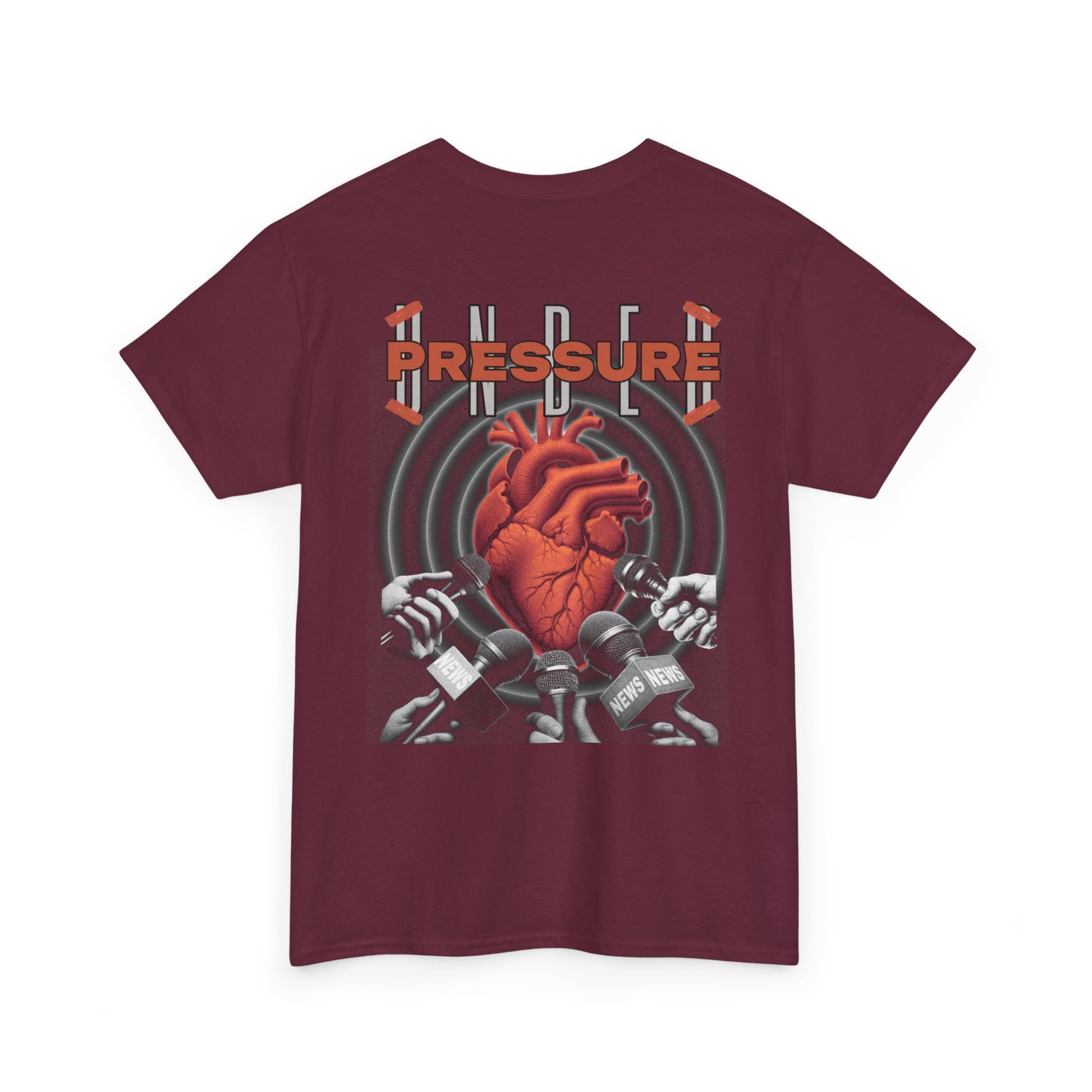 This black classic-fit tee carries a dark, gritty energy — a small signature logo at the chest and a bold, cinematic back print that centers a beating anatomical heart framed by tense barbell hands and concentric pressure rings. It reads like a snapshot from late-night training sessions and underground shows: raw, focused, and loud without shouting. Wear it when you want your look to speak of grit and drive — layered under a denim jacket for a city commute, or worn solo at rehearsal, the design pulls attention toward perseverance and intensity.