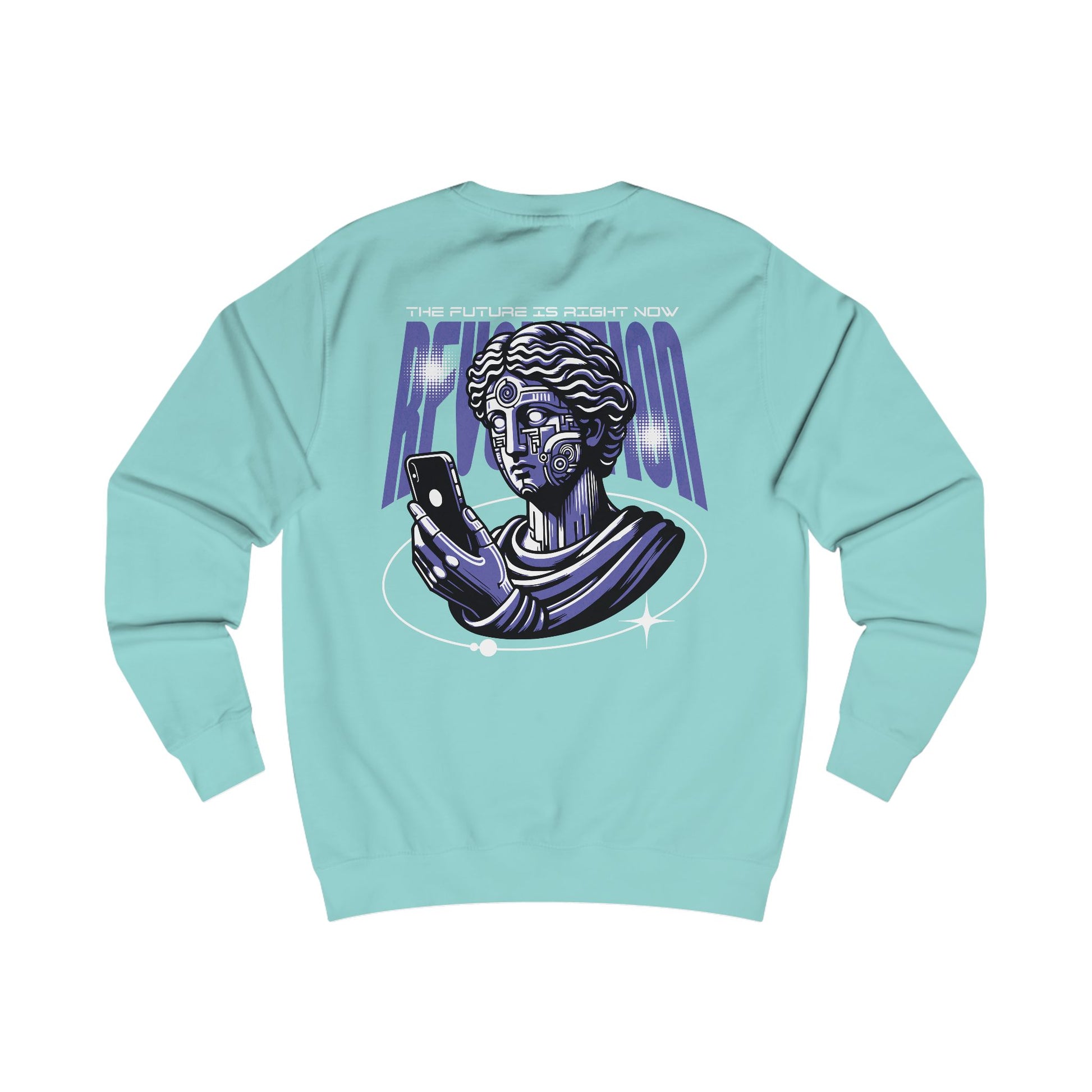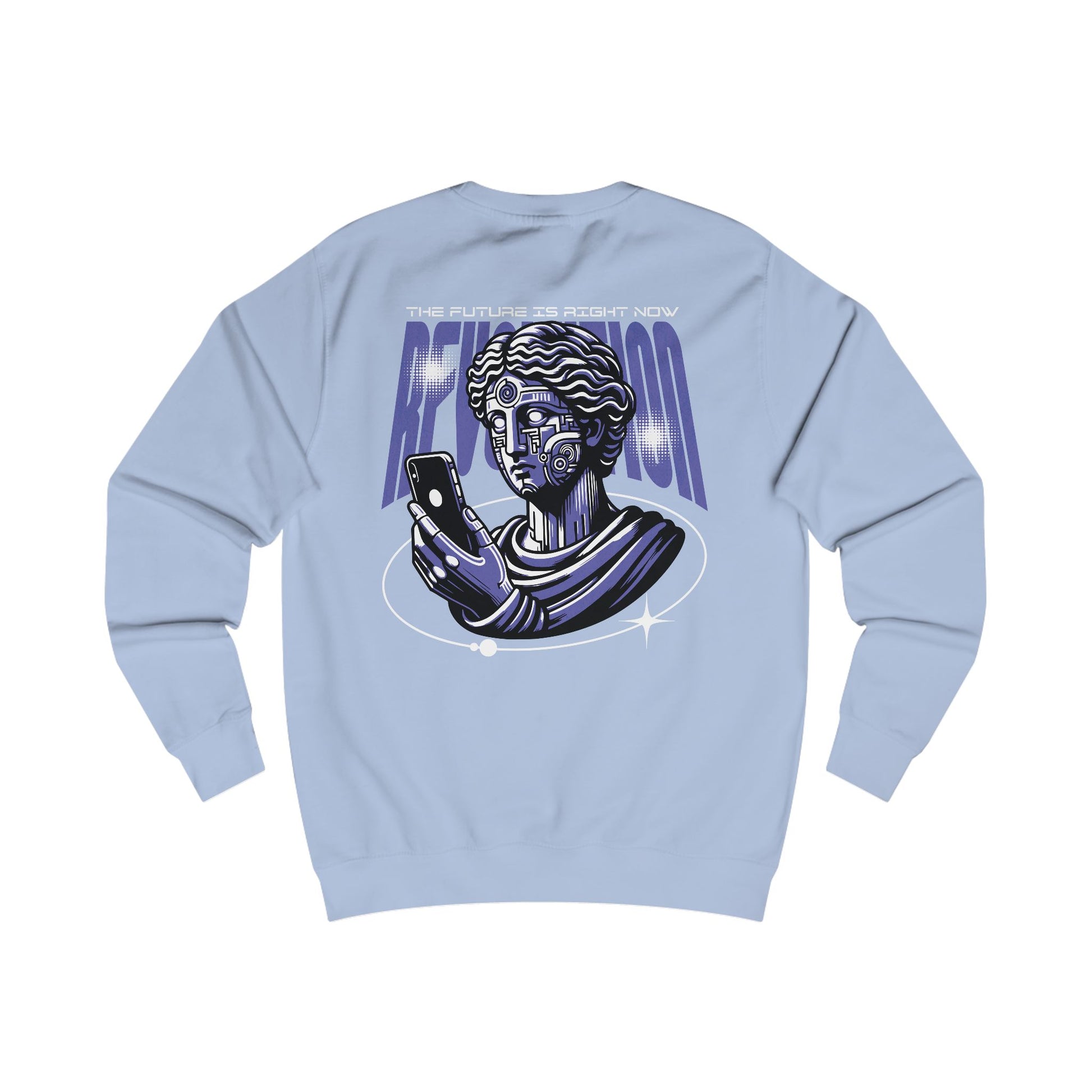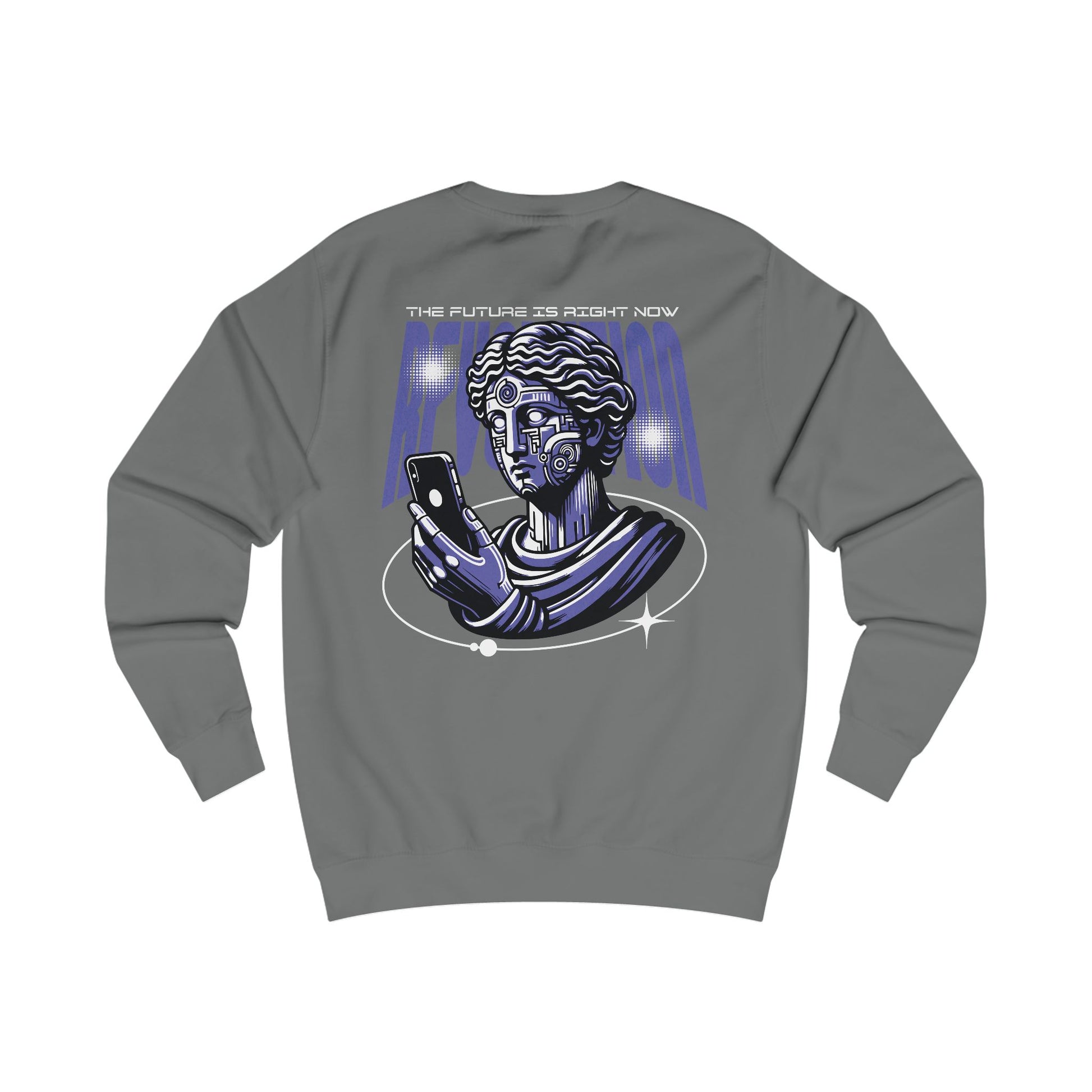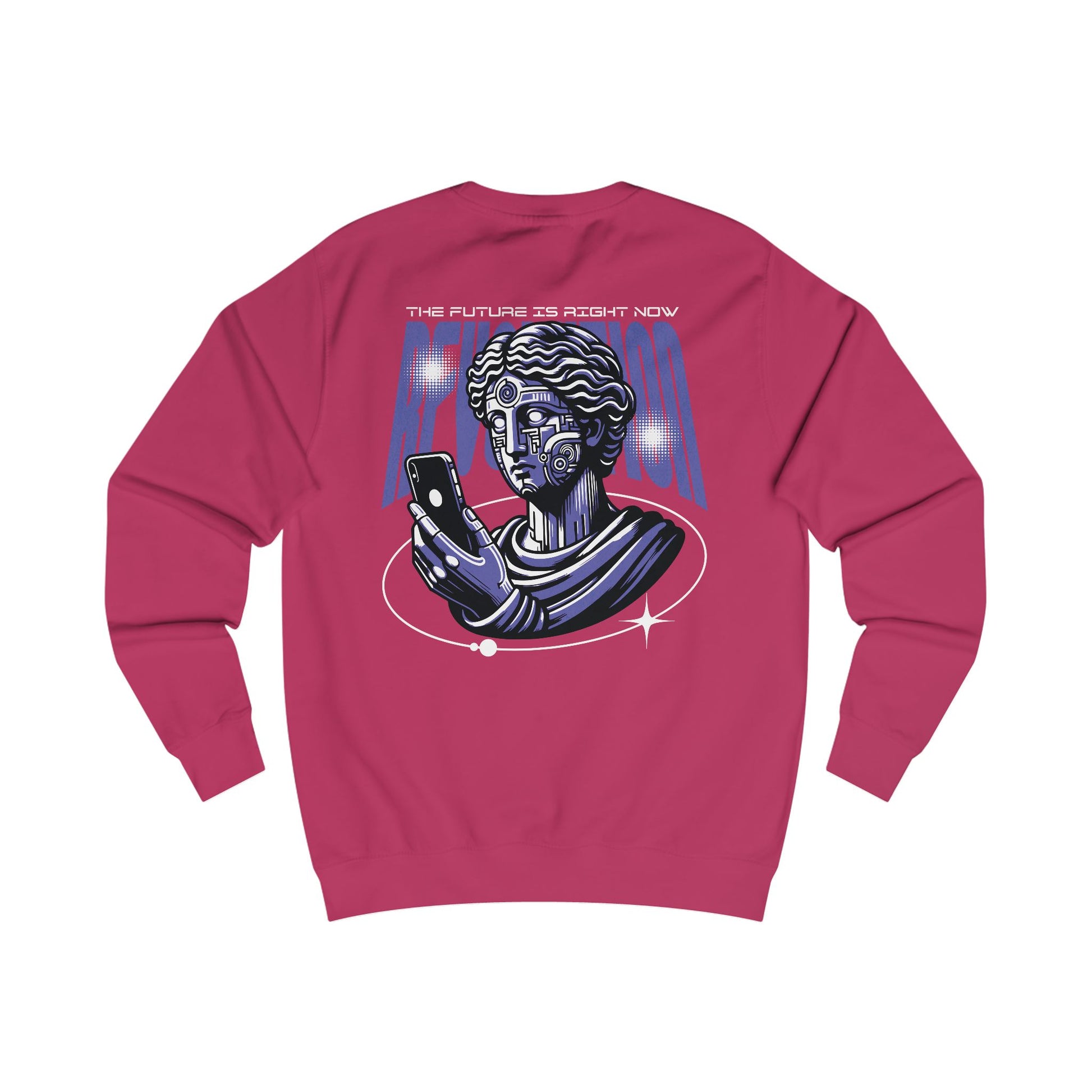 Soft, structured, and street-ready — this sweatshirt brings artful retro-futurism into everyday wear. A warm golden base frames a bold back illustration: a classical bust reimagined with digital glitches, a phone in hand, and sculpted typography that reads like a manifesto. The front keeps it subtle with a small, hand-drawn wordmark over the heart. Wear it layered or solo when you want your outfit to feel thoughtful, a little rebellious, and unmistakably modern. The medium-heavy fabric and tailored side seams keep the silhouette clean while the ribbed collar and cuffs hold their shape through many wears. It settles in like a favorite record: warm, familiar, and worth reaching for.
