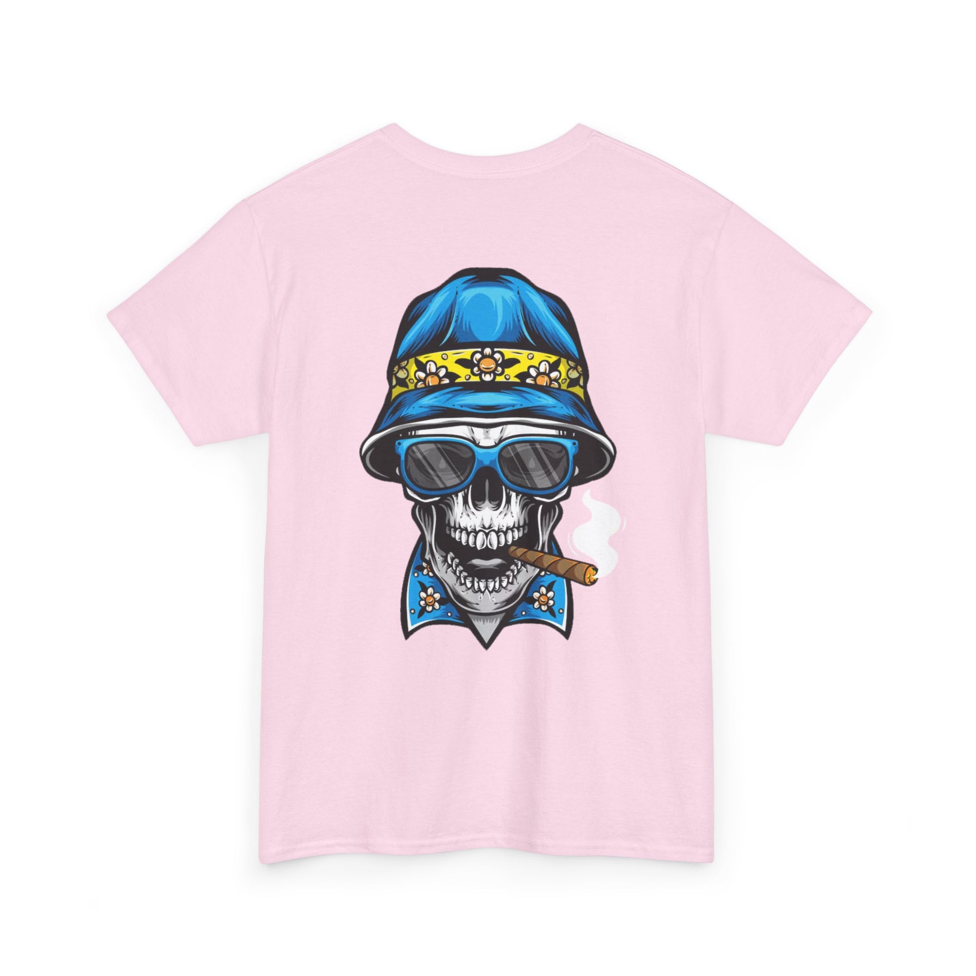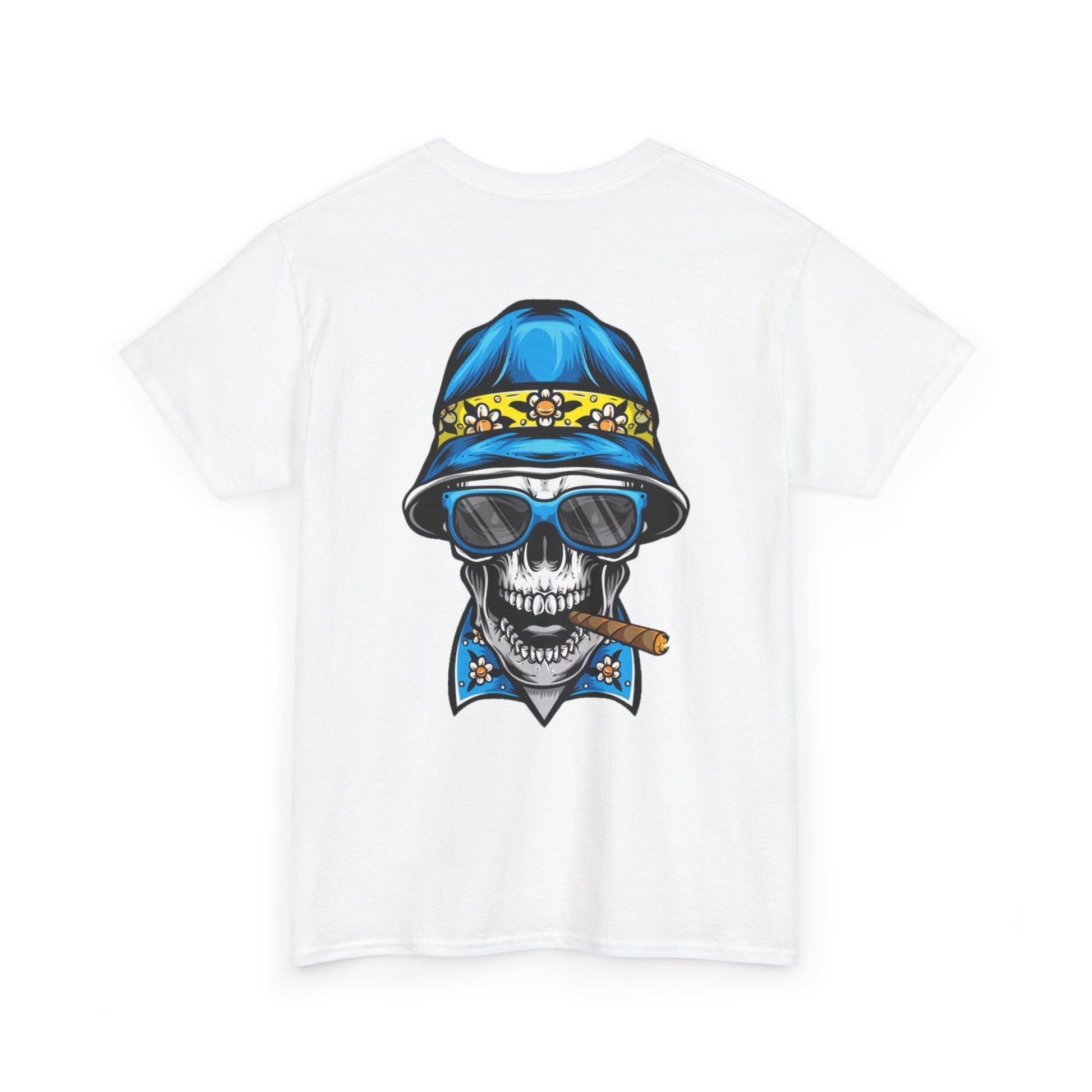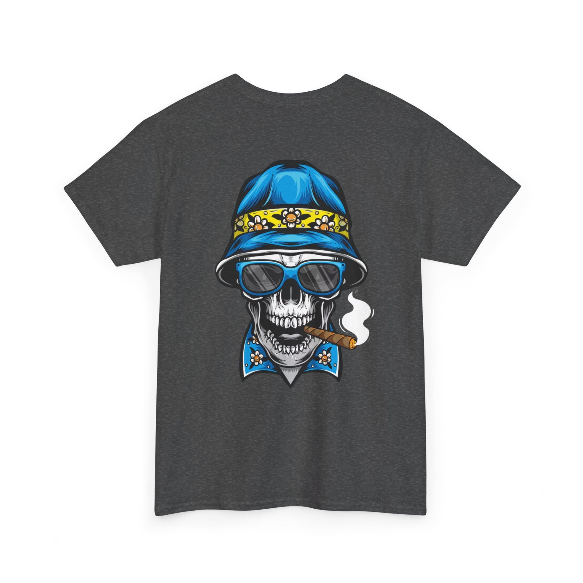 This relaxed cotton tee blends everyday comfort with bold personality. A soft, mid-weight fabric and classic crewneck create a familiar, wearable canvas while the back showcases a striking illustrated skull wearing a blue bucket hat, sunglasses and a cigar — a tongue-in-cheek mix of rebellious edge and sun-soaked, island vibes. Short sleeves and a neat chest detail keep the silhouette balanced so the artwork becomes the focal point. Wear it with worn denim, boardshorts, or layer under an open shirt for evenings out. It settles into weekend routines and spontaneous road trips alike, giving a confident, lived-in look without fuss.